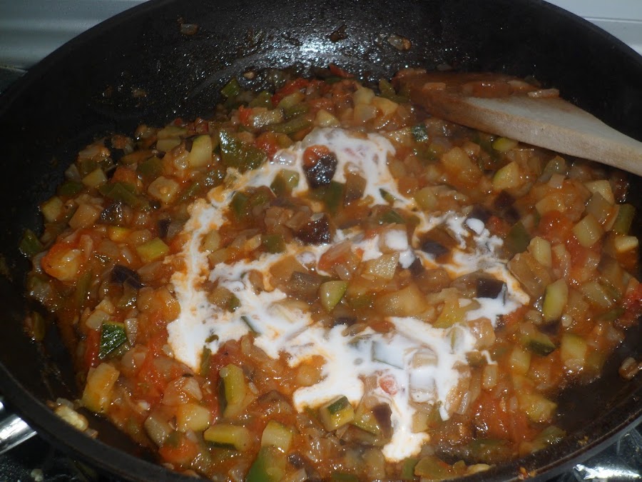 Cuando estén listas, echaremos la nata (crema de leche) líquida y removeremos bien la mezcla.