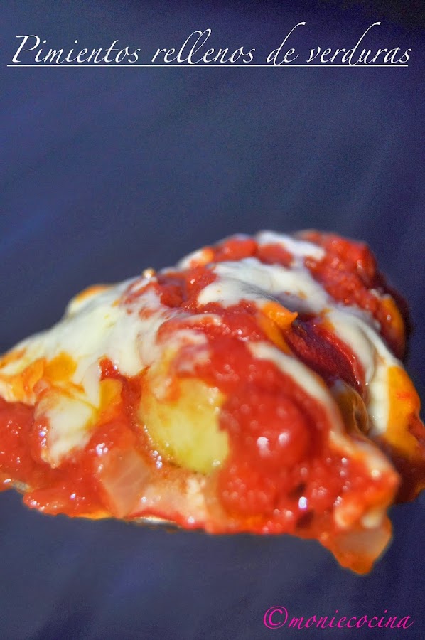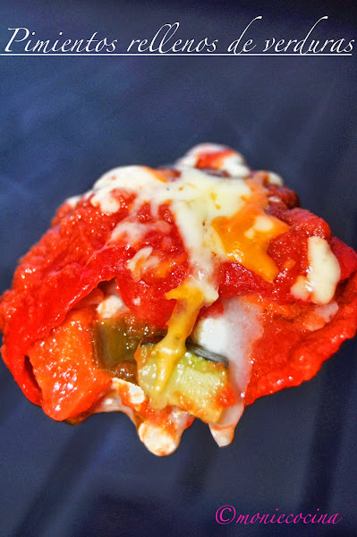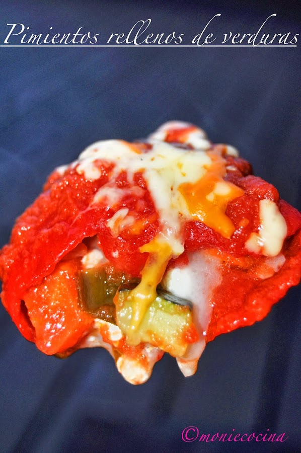 Rellenamos los pimientos hasta la mitad con las verduras, ponemos un trocito de queso de cabra y seguimos con más verduras hasta llenar el pimiento. Dejamos en una fuente apta para horno con una capa de tomate, colocamos todos los pimientos, espolvoreamos con queso para gratinar al gusto y horneamos 30 minutos a 180 grados.