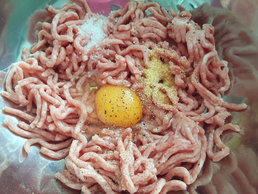 3. - Mezclamos la carne con la cebolla frita, el huevo, el ajo en polvo y salpimentamos.