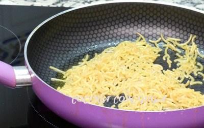 Para ello, utilizamos una sartén grande, echamos aceite de oliva y los fideos de fideua. Una vez que los fideos estén doraditos, retiramos.