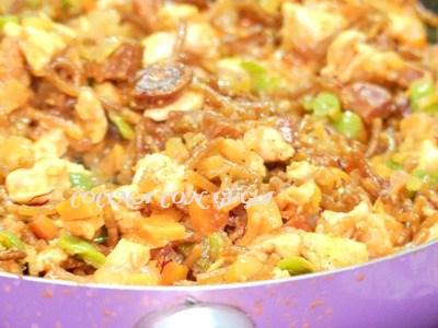 Al sofrito añadimos pechuga de pavo troceado, chorizo picado, e incorporamos la fideuá que habíamos retirado.