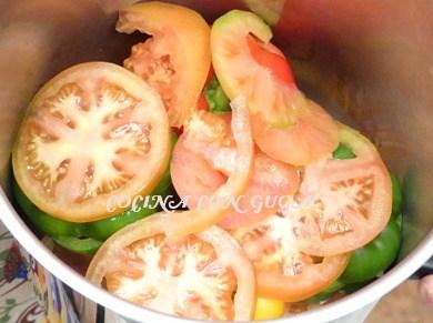 En una olla (hemos escogido una olla exprés) vamos echando tomate natural a rodajas, y vamos colocando los pimientos ya rellenos, encima de ellos volvemos a tapar con ruedas de tomate.