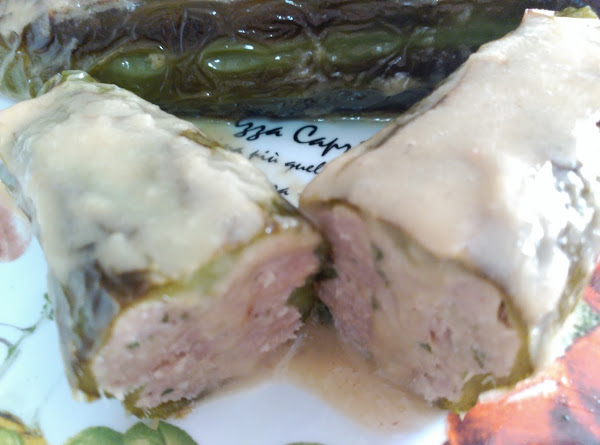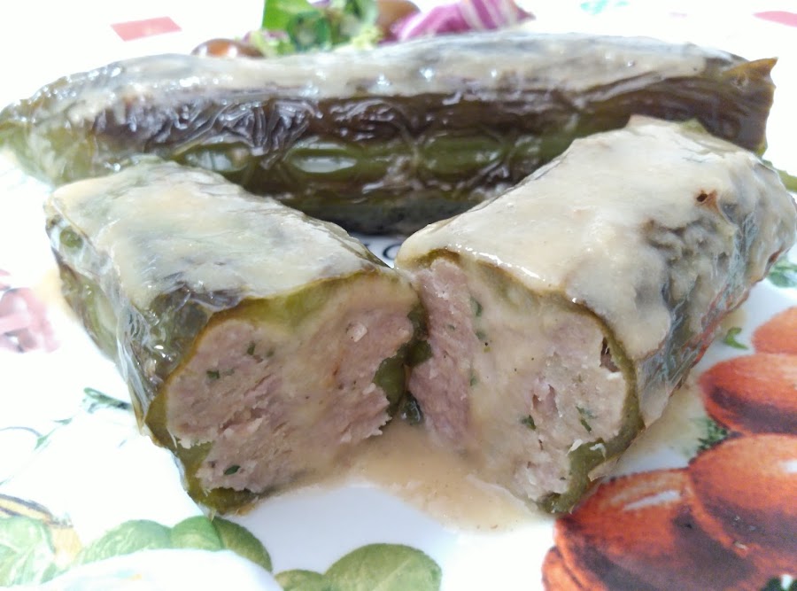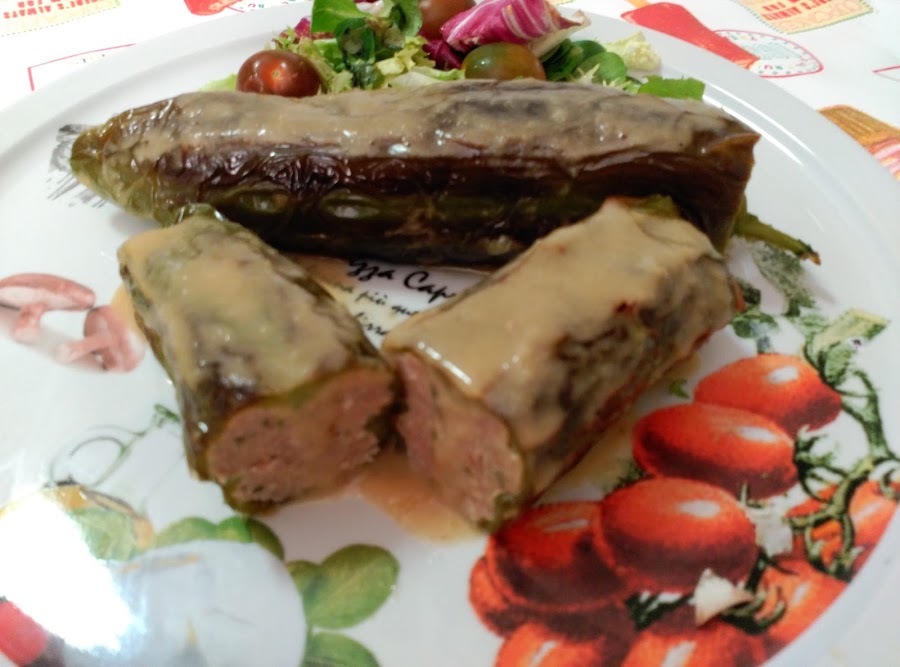 Corta el pimiento por la parte donde está el tallo y quítale las pepitas pasándolo por el agua. Rellena con la carne picada ayundándote con una cucharita. Procura que llegue hasta abajo del pimiento con cuidado de que no se rompa.