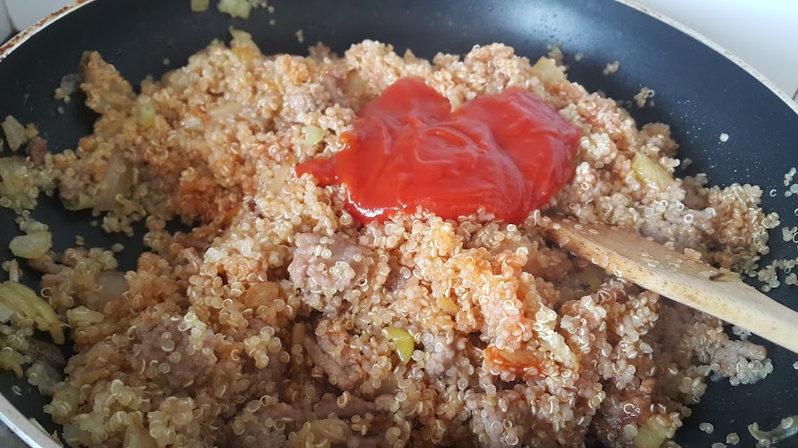 Pasados unos 5 minutos añadimos la quinoa hervida y un par de guindillas cortadas pequeñas. Salteamos a fuego fuerte durante un par de minutos. Transcurrido ese tiempo bajamos el fuego, añadimos 2-3 cucharadas soperas de salsa de tomate y lo dejamos unos minutos más.