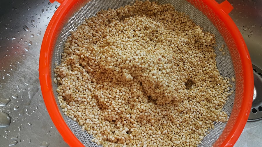 Lo primero que haremos será poner el horno a 200ºC con calor arriba y abajo. Mientras empezaremos a preparar el relleno de los pimientos. Lo primero será lavar muy bien la quinoa y hervirla durante 15 minutos.