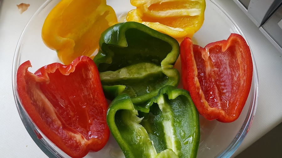 Lavamos bien los pimientos, los partimos por la mitad, retiramos las pepitas y los ponemos en una fuente apta para horno con un chorrito de aceite. Los cocinaremos durante unos 15-20 minutos.