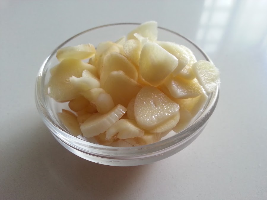 2. - Pelamos y cortamos en láminas los ajos.