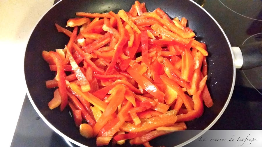 Enjuagamos los pimientos y les quitamos el rabito, las membranas blancas que tienen en el interior y los cortamos a tiras.