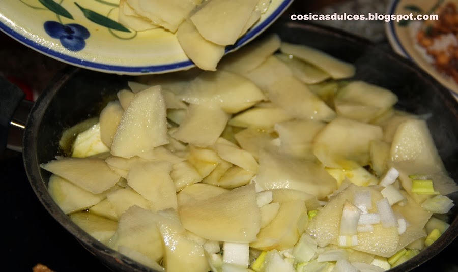 Comenzamos por freir en una sartén las patatas cortadas a láminas y la cebolla rallada.