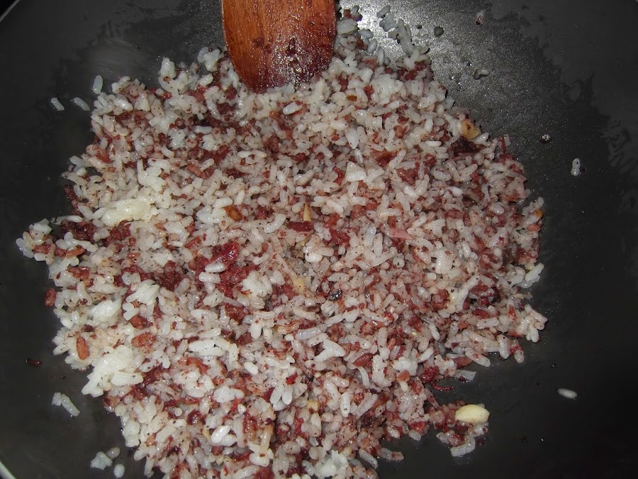 El siguiente paso es echar un poco de aceite en la sartén, pelar, cortar el diente de ajo en trozos pequeños y añadírselo a la sartén. Mientras tanto vamos desmenuzando la morcilla y la añadimos a la sartén, la dejamos durante cinco minutos y echamos el arroz. Le damos un par de vueltas y ya está listo el relleno. Daros cuenta que luego se terminarán de hacer cuando se frían los pimientos, por lo que si empleáis otro tipo de productos no dejéis que se cocine del todo, ya que luego les queda otro calentón.