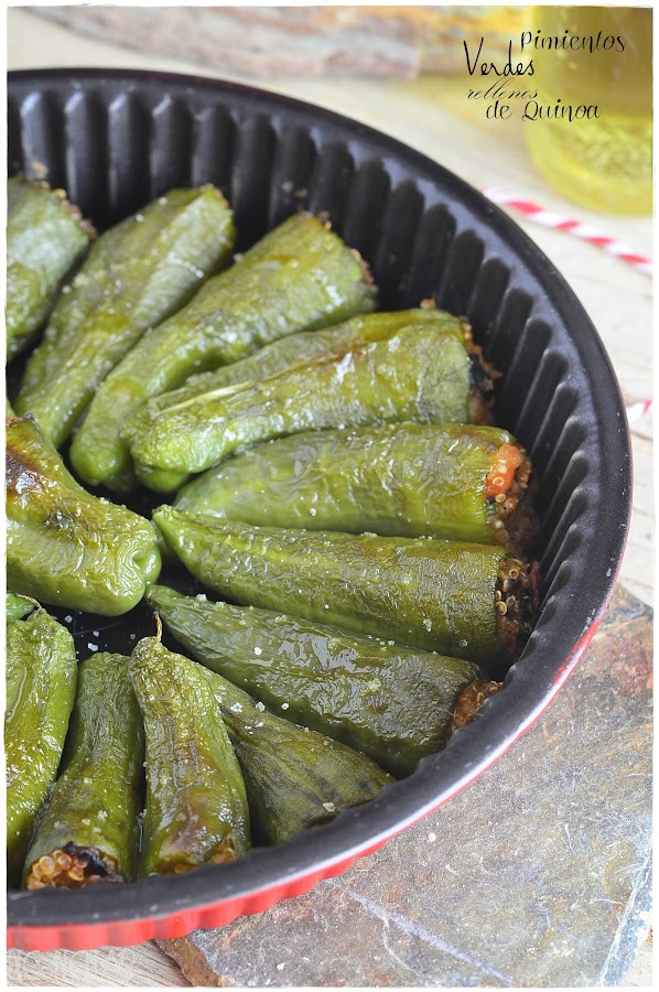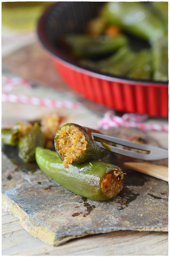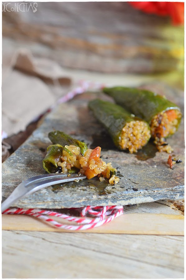 La realizamos, cocinando la quinoa 15 minutos después de haberla enjuagado bien debajo del agua del grifo con el doble de líquido al que corresponde su peso. Una vez cocida, la mezclamos con un sofrito de cebolla, ajo, zanahoria y calabacín que tendremos listo mientras se cocinaba. Por último, agregamos tomate frito, salamos al gusto, y rellenamos los pimientos todo lo que podamos para posteriormente llevarlos al horno a 180° por 20 minutos, después de añadirles un chorro de aceite de oliva y sal por encima