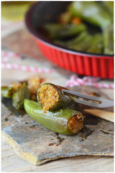 Para realizar esta receta, utilice pimientos muy pequeños verdes semipicantes .Lleva más trabajo el tener que rellenarlos pero merece la peña porque se convierte en un entrante de bocado y son como las pipas, no paras hasta comerlos todos