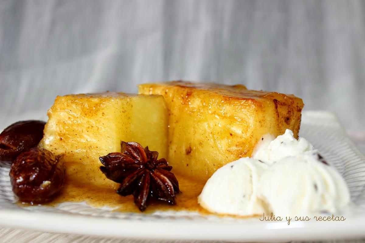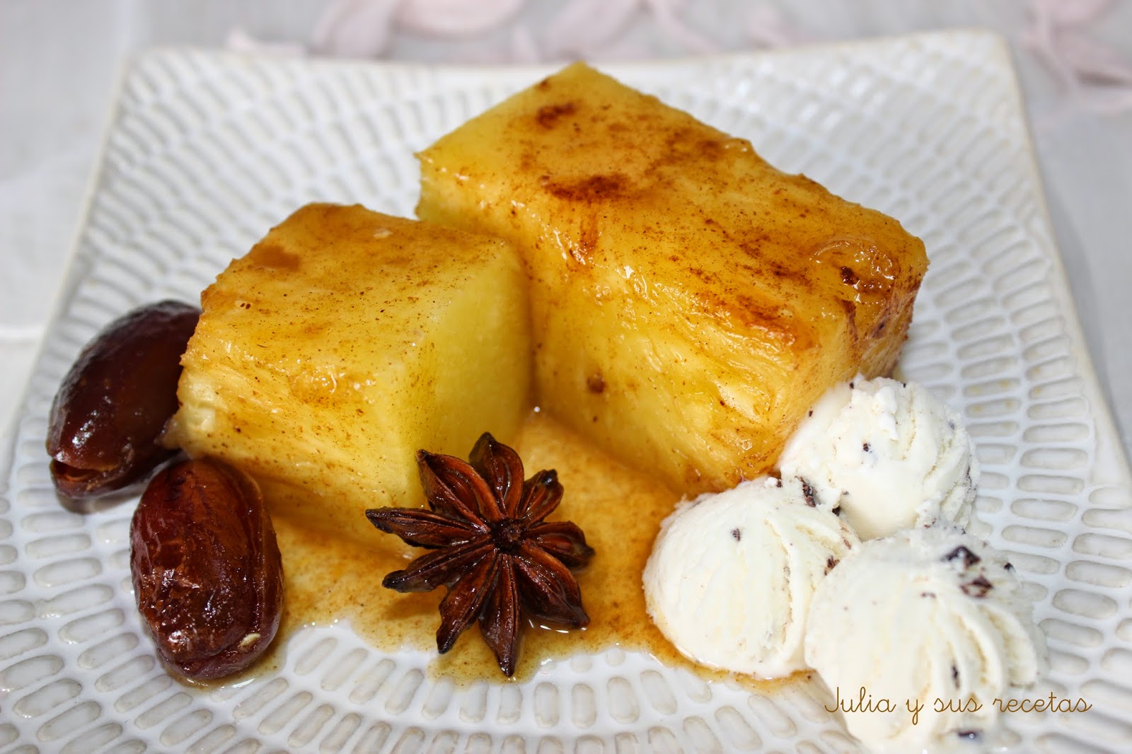 Sacamos la piña y la servimos cortada en dados y regada con la salsa acompañada de los dátiles y una bola de helado.