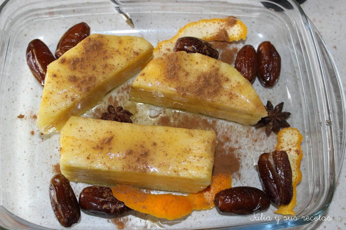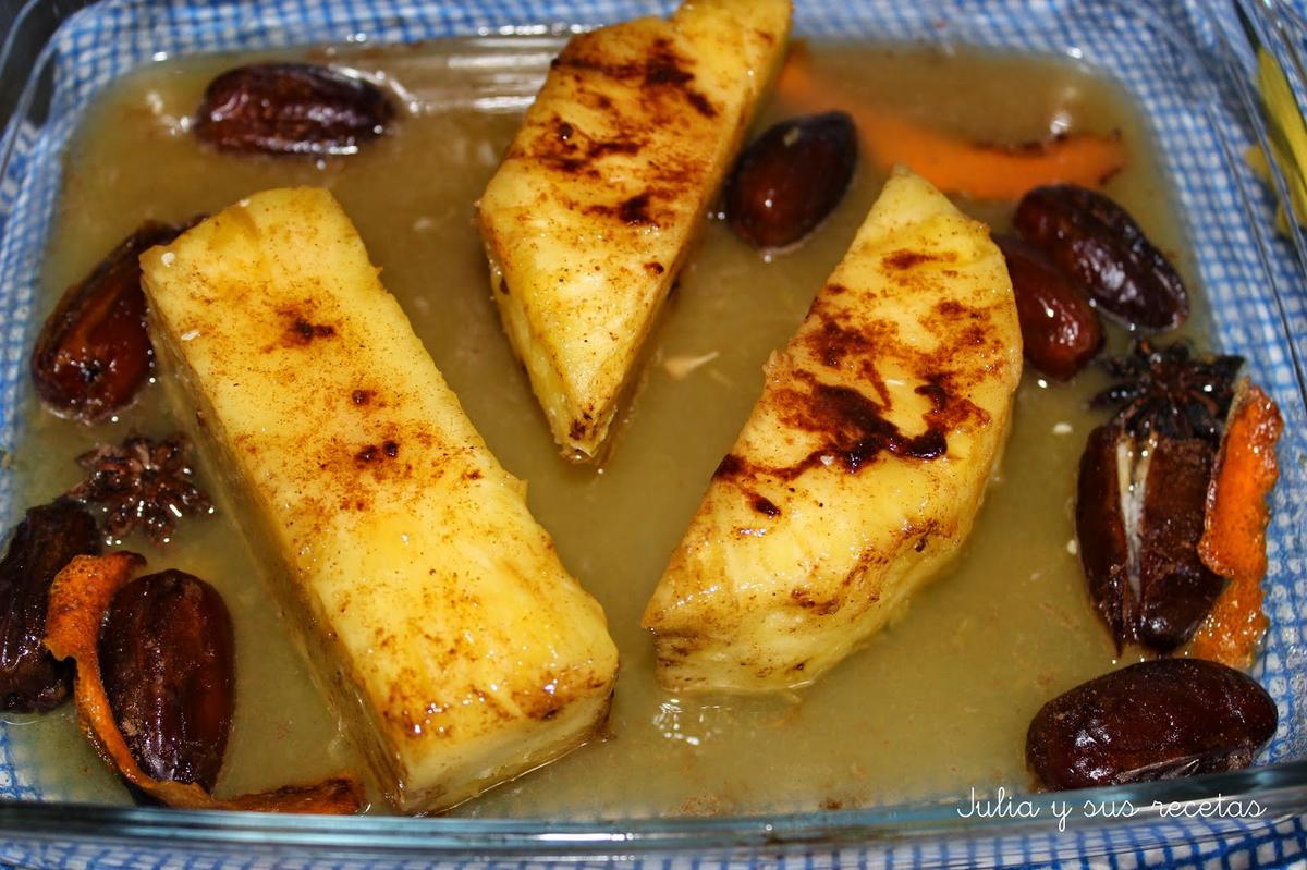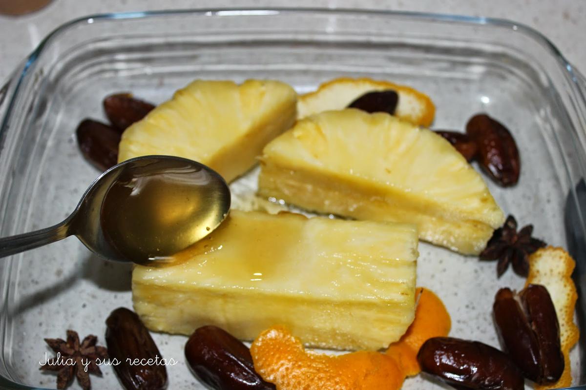 En una fuente de horno echamos la piel de naranja, el anís estrellado, los dátiles sin el hueso y la piña.