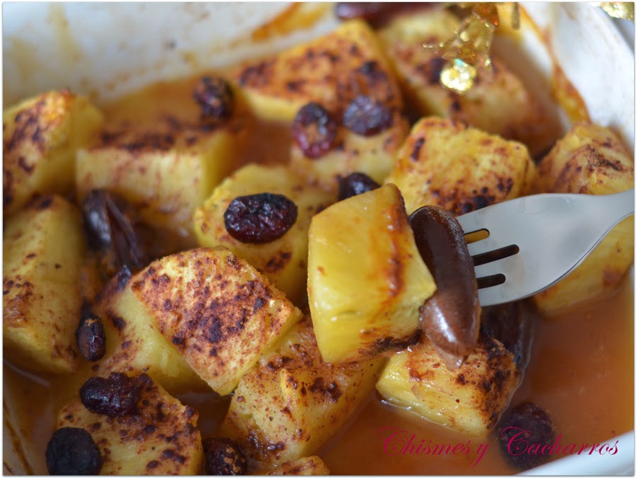 Un postre perfecto para las comilonas que nos damos los días de Nochebuena, Navidad, etc.... Piña con miel, dátiles, canela y nuez moscada..... uff.No dejes de probarlo, te encantará.