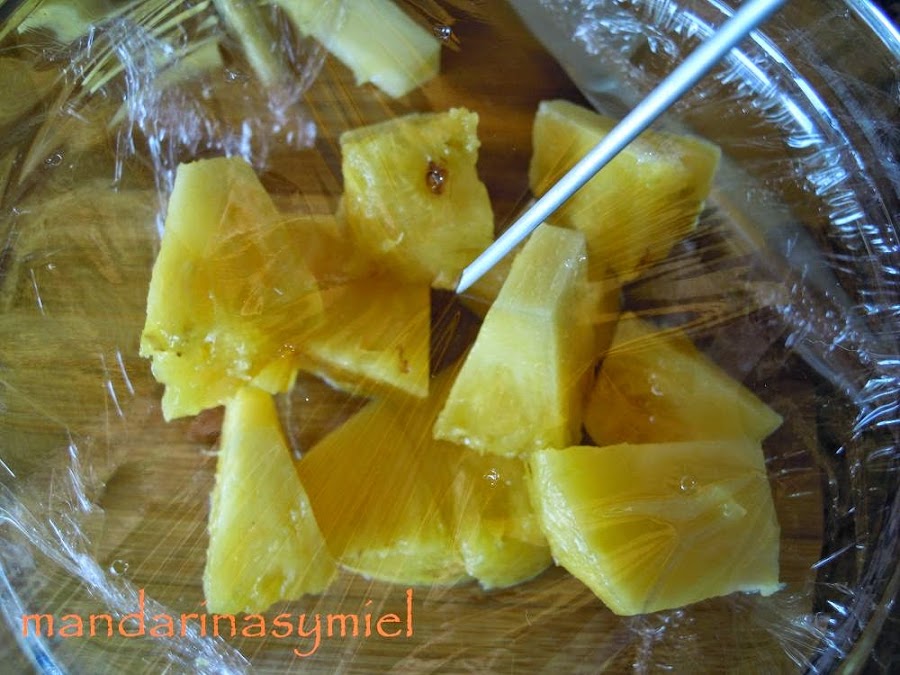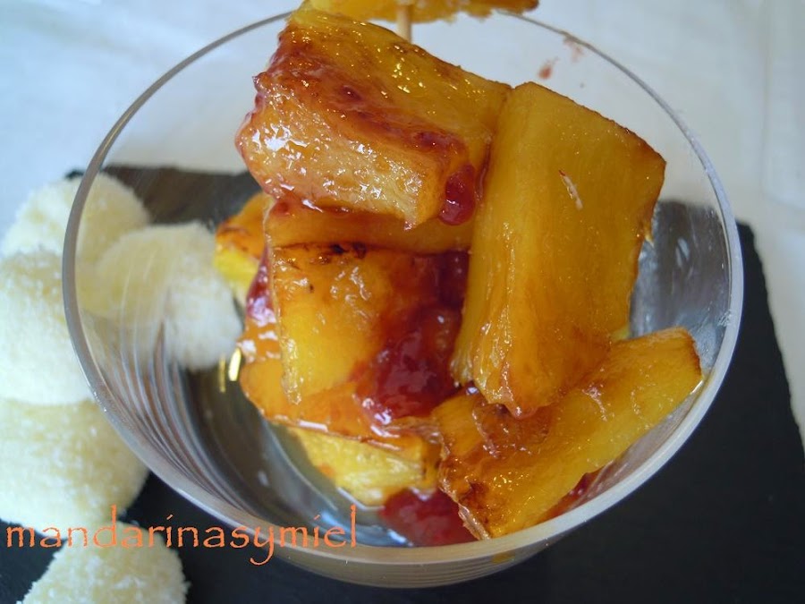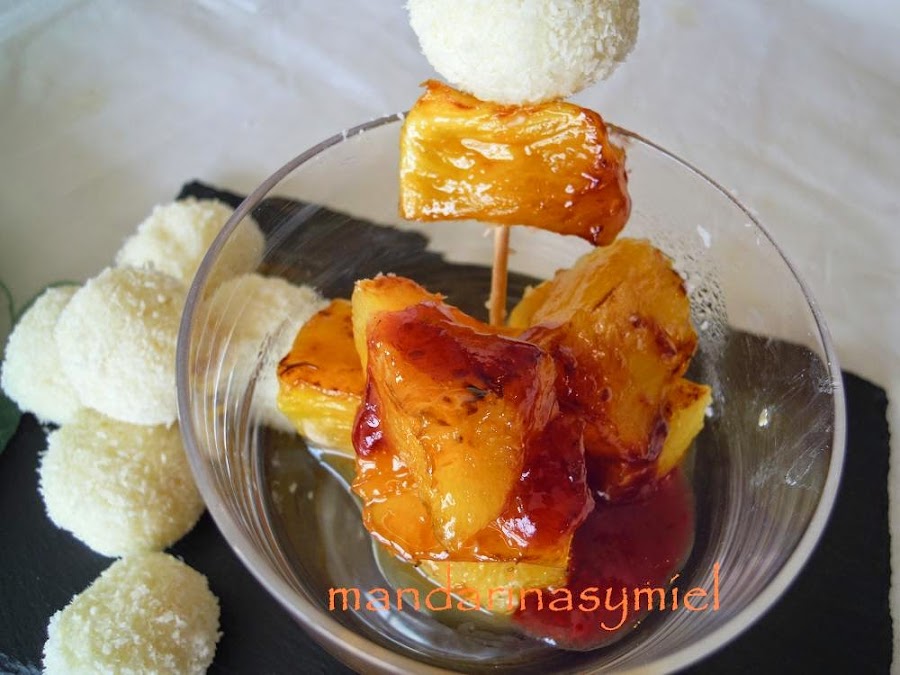 Este mes la anfitriona del reto Alfabeto dulce, ha sido Débora de Hay un recuerdo en mi plato, y ha elegido como ingrediente la piña; mi receta para el reto es: piña caramelizada con unas bolitas de coco, que combinan de categoría con la piña. Es una receta muy sencilla, se prepara en el microondas y unos segundos en plancha....creo que es la primera receta, tan sencilla que pongo en el blog, pero os aseguro que está deliciosa.