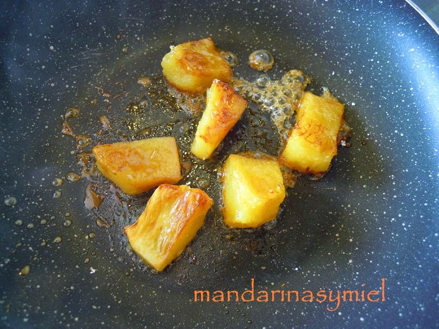Pon una plancha o sartén al fuego, cuando esté bien caliente, dora la piña con el azúcar.