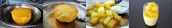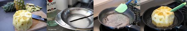 Poner en una sartén los ingredientes del bol y calentar a fuego medio hasta que se disuelva el azúcar. Incorporar la piña e ir bañándola continuamente con el almíbar, dándole la vuelta de vez en cuando, hasta que el azúcar empiece a tomar color.
