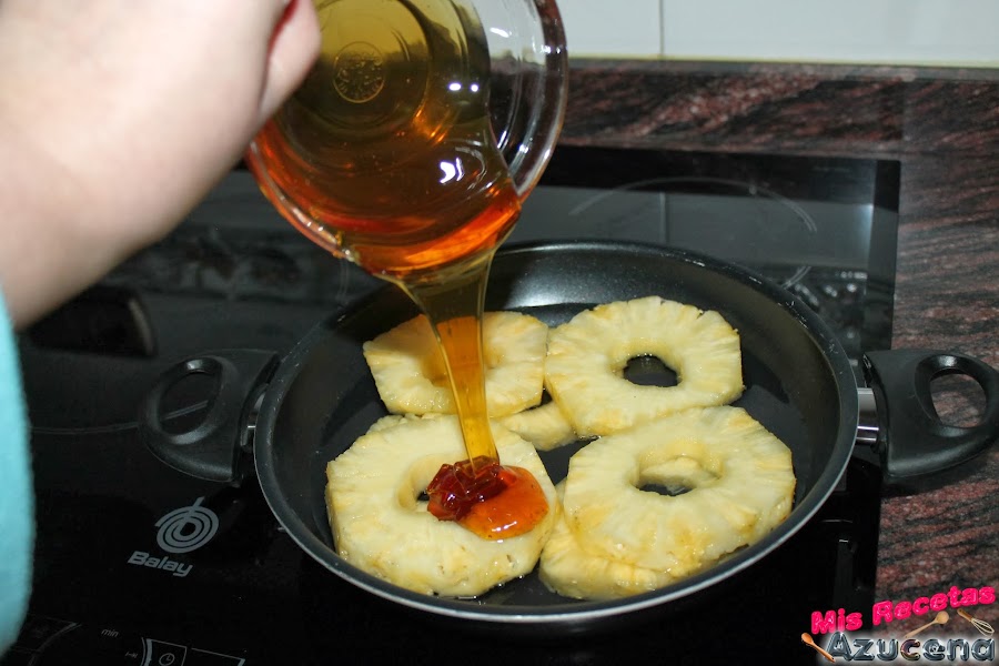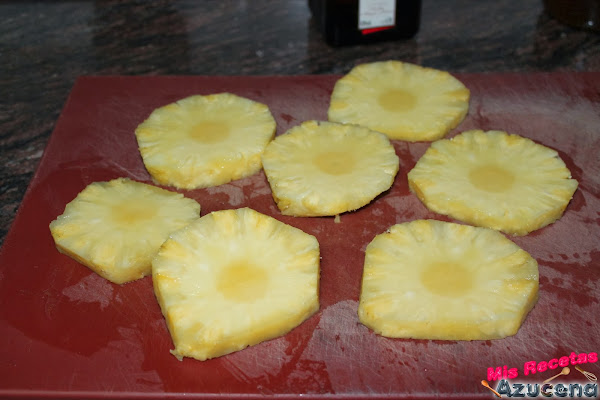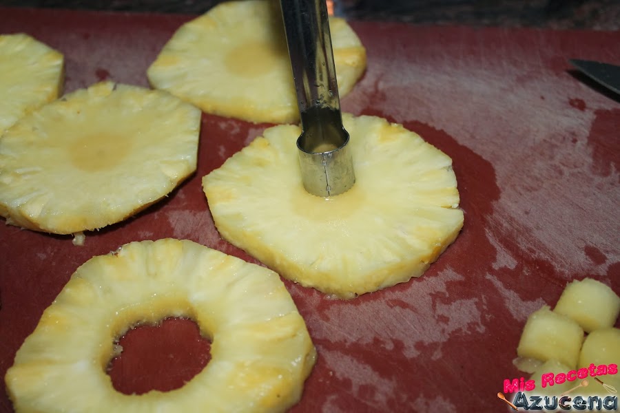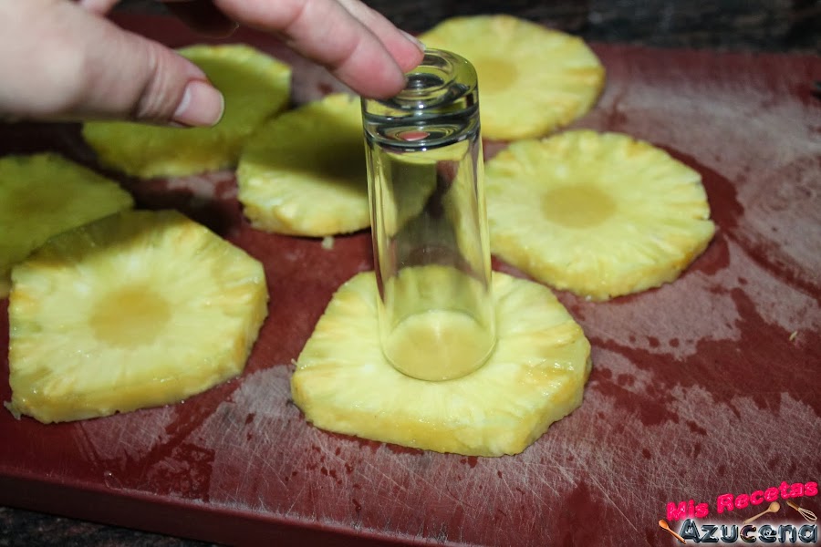 Lo primero que aremos será pelar la piña y cortarla en rodajas de un dedo de grosor, con ayuda de un descorazonador o con un vaso de chupito lo quitaremos el centro que desecharemos.