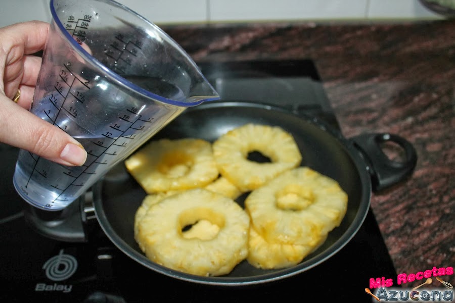 Para esta receta necesitaremos una sartén u olla, que no sea muy grande, piensa que el líquido que le pongamos y el que suelte la piña tiene que cubrir las rodajas.