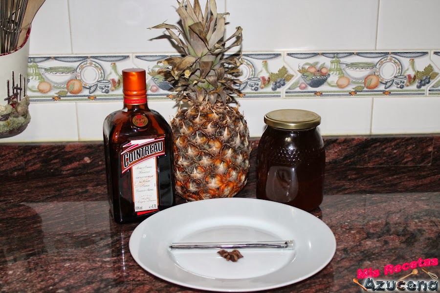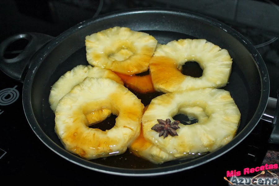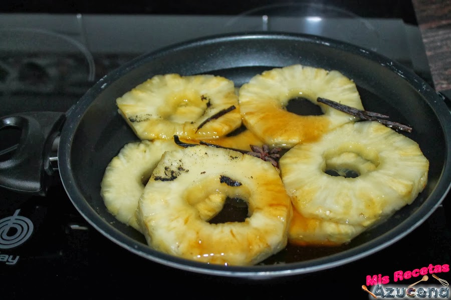 Ponemos la sartén al fuego, a fuego medio, añadimos las rodajas de piña, el cointreau y el anís estrellado.