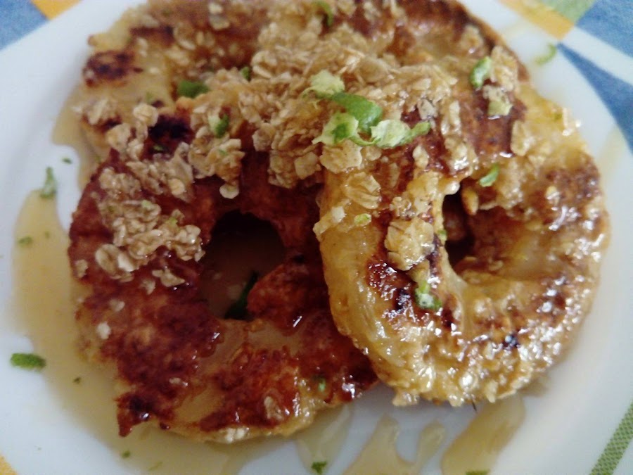 2 - Pasarlas a un plato y freirlas con la mantequilla , dorarlas bien 1 min cada lado, en un cazo a parte, calentar la miel junto a la avena sobrante y 1 cucharada de agua, en esta mezcla untamos las rodajas de piña .
