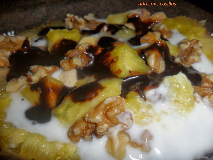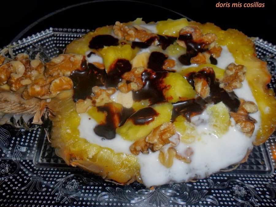 Limpiamos bien los trozos de piña de impurezas y troceamos. Los agregamos encima de los plátanos, las nueces mondadas y por último rociamos de sirope de chocolate. Opcional.