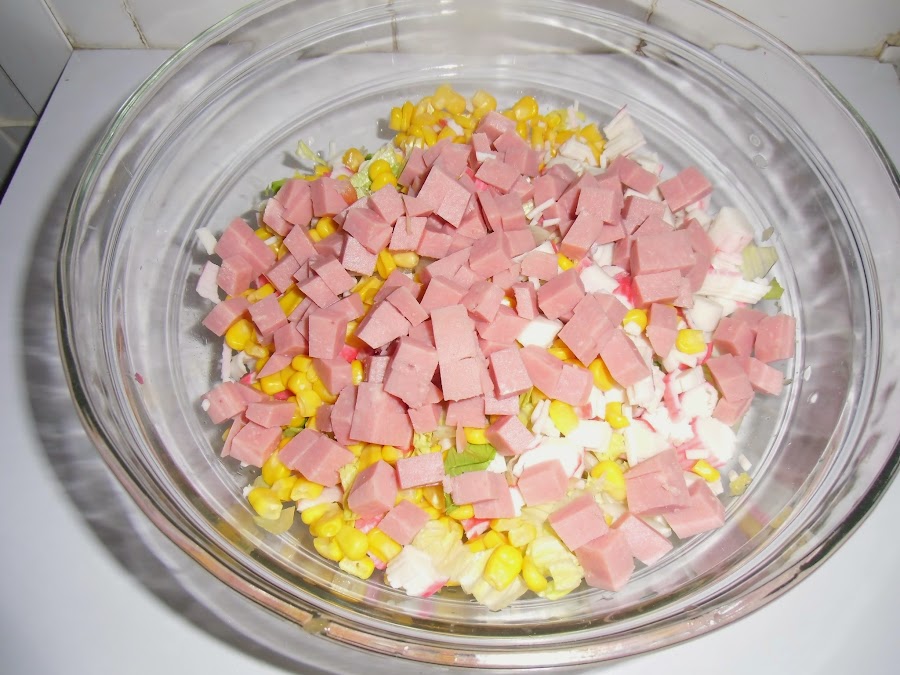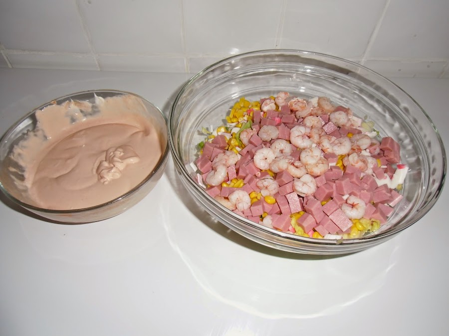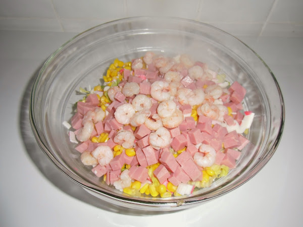 Incorporamos el jamón cocido cortado a daditos y las gambas previamente cocidas