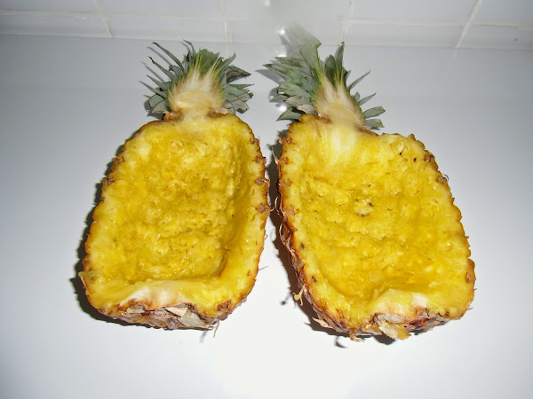 Con la ayuda de un cuchillo vaciamos la piña y reservamos la carne cortada a daditos y el jugo en un bol.