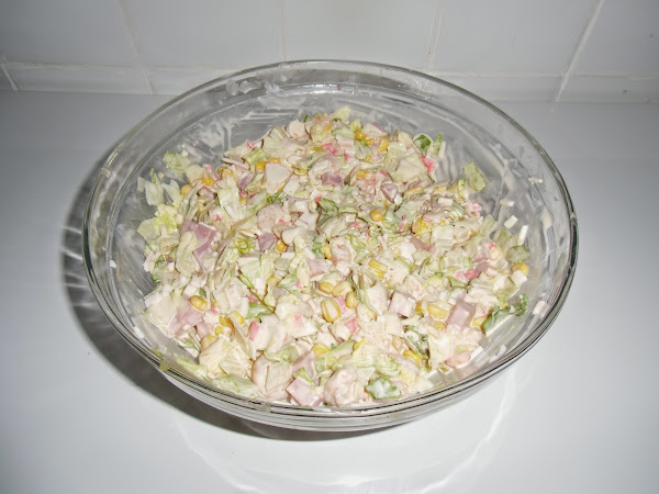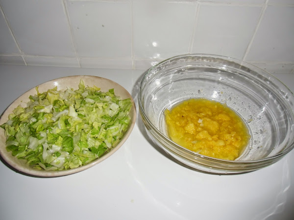 Picamos la lechuga y la mezclamos en el bol con la carne y el jugo de la piña.