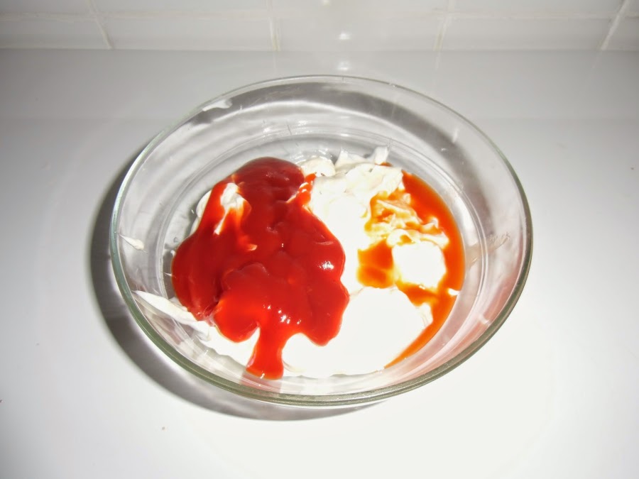Le añadimos 2 cucharadas colmadas de ketchup, un chorrito de salsa picante y mezclamos bien
