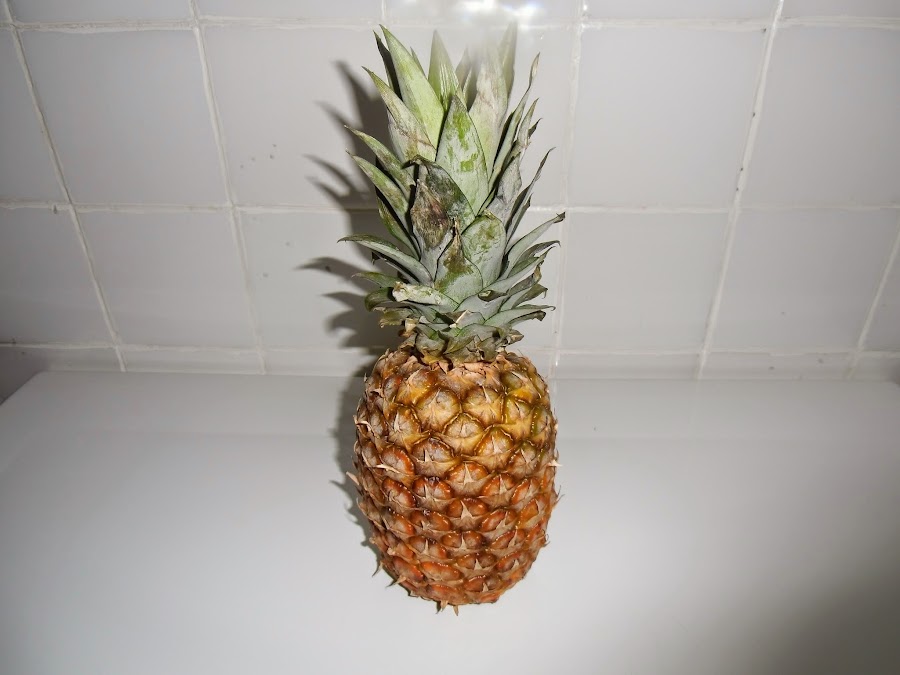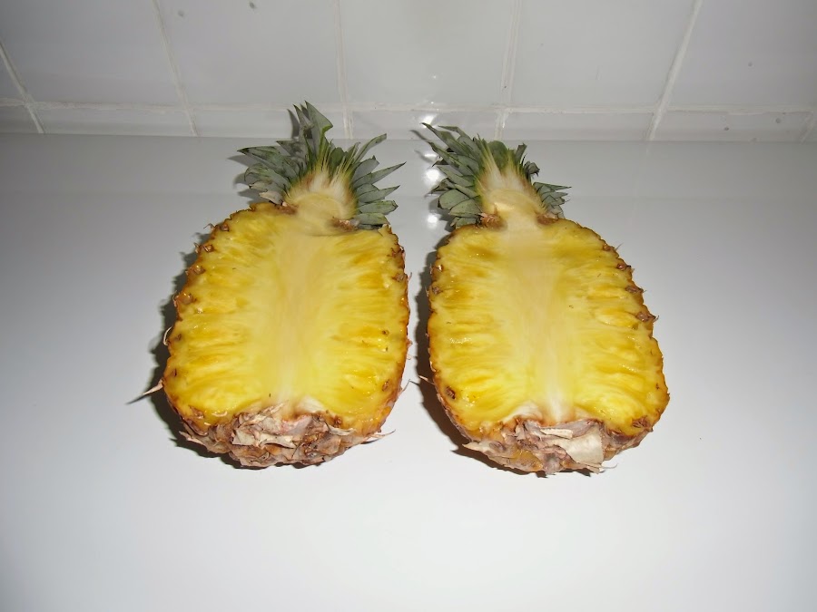 Lavamos, secamos la piña y la cortamos por la mitad.