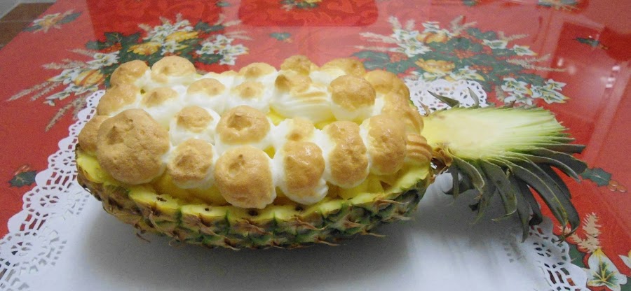 Dento de la piña se ponen los bizcochos partidos y pasados ligeramente por el coñac, encima se pone el turrón cortado muy finito y al final los trozos de piña.