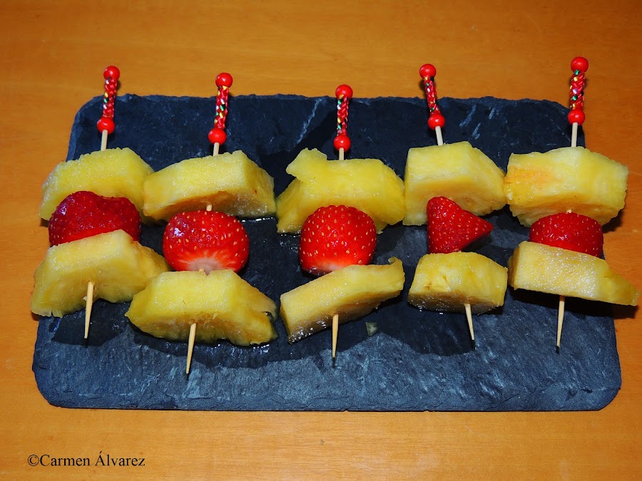 Y presentarla de la manera que más os guste. Yo hice estas pequeñas brochetas con fresas.