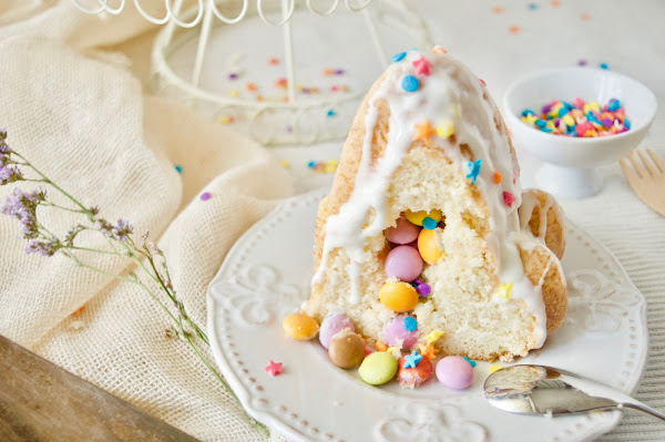 Este mes en nuestro reto de #BundtBakers, había que preparar una bundt cake de cumpleaños. Se me ocurrió que qué mejor que hacer un bizcocho piñata, que a los niños les encanta porque al abrirlo se llevan la sorpresa por dentro de que está relleno de chocolates, lacasitos, confeti,...