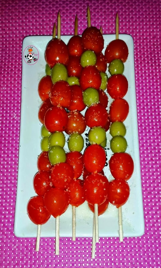 Lavamos los cherrys,dejamos que se escurran bien y vamos metiéndolos en un palillo de madera junto con las aceitunas. Los colocamos en un plato,añadimos un chorrito de aceite de oliva vigen extra y un poquito de sal.