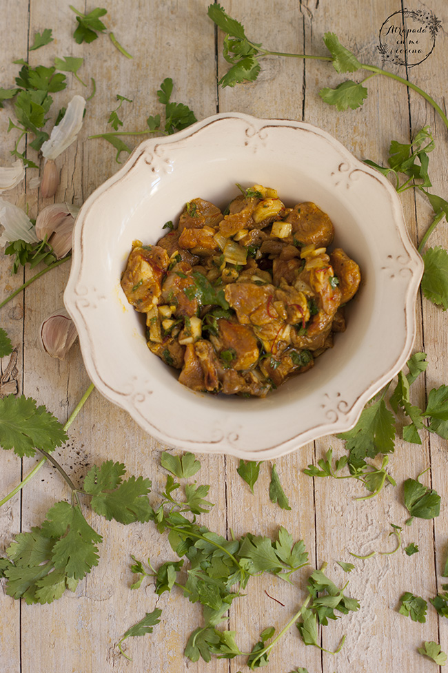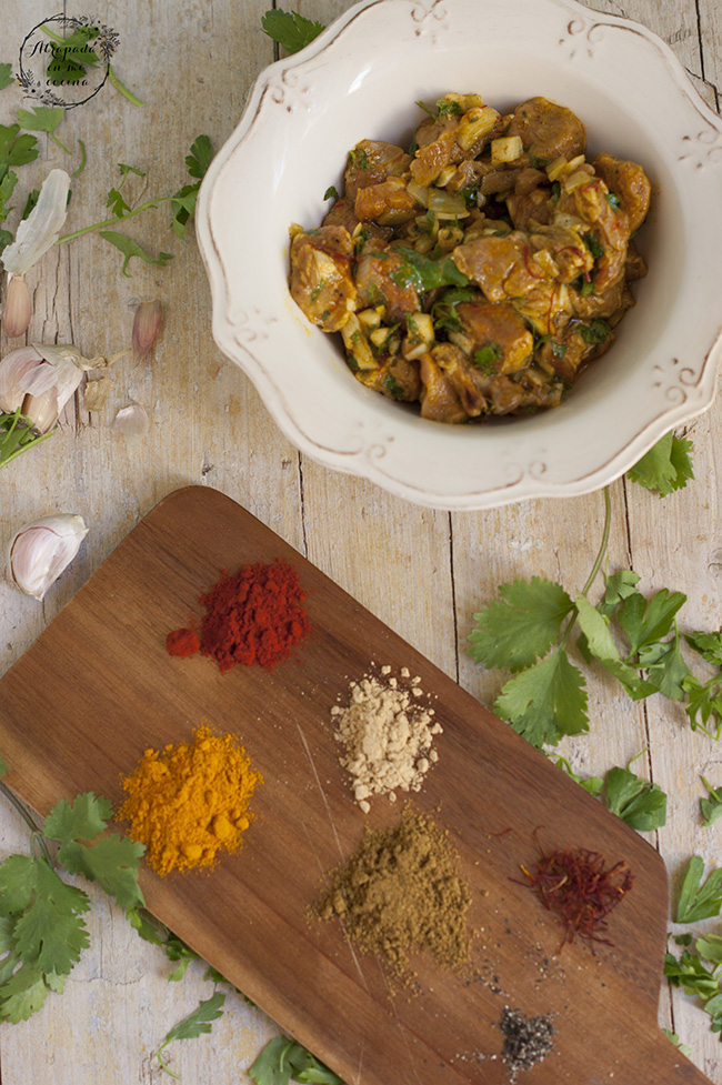 Lo ideal en este tipo de elaboraciones es que se preparen el día antes para que la carne adquiera todos los sabores del adobo, por lo que prepararemos la noche antes y meteremos en el frigorífico bien tapado. Para ello cortamos la carne en trozos pequeñitos, libres de la mayor cantidad de grasa posible. Introducimos en un bol y vamos añadiendo las especias. No he puesto cantidades, pero para la cantidad de carne que se ve en la foto puse una media cucharadita de cada una de las especias, y no queda nada fuerte, por lo que si os gusta aún más pronunciado el sabor de las especias podéis añadir más. Añadimos a la carne la sal. Después una cucharadita de comino, otra de jengibre, una de pimentón dulce, otra de curcuma, unas hebras de azafrán y pimienta negra molida. Cortamos un poco de cebolla en cuadraditos pequeños y un ajo bien picadito y añadimos. Exprimimos medio zumo de limón y añadimos aceite de oliva virgen extra. Por último le añadimos el cilantro y el perejil picados, removemos bien para que quede todo bien impregnado, tapamos con un film transparente y metemos en el frigorífico hasta el día siguiente.
