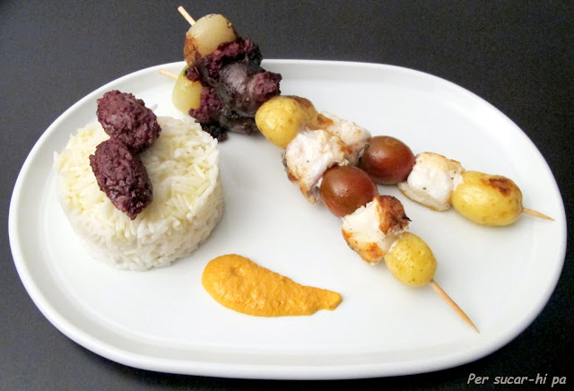 Como dice su autora, del blog Persucar-hi pa, en la vida hay que tomar riesgos... y ella lo tomó juntando morcilla y rape sin pensar en lo asombrosamente bueno que iba a quedar esta brocheta...mira, mira...