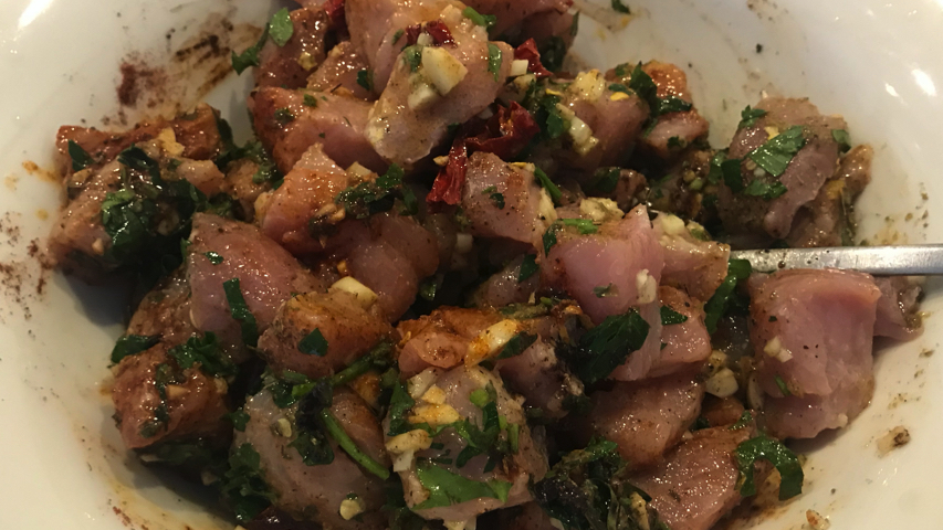 Ensarta los trozos de carne aliñados en los pinchos. Los pinchos pueden ser de madera (meterlos en agua una hora antes para que se hidraten y no se quemen al fuego) o metálicos.