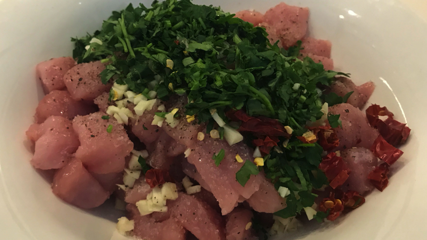 Añade la sal, la pimienta, el ajo picado, el perejil fresco, la guindilla picante picada, el comino, la canela, el pimentón dulce y el picante, la cúrcuma, el zumo y la ralladura de limón.
