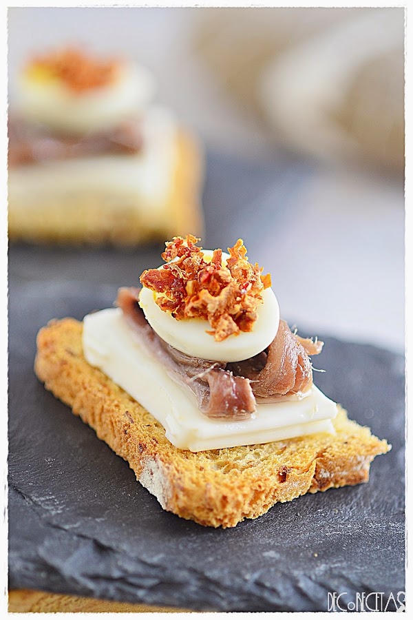 Lo montamos poniendo encima de una tosta queso tierno, unas anchoas, el huevo y el polvo de tomate.