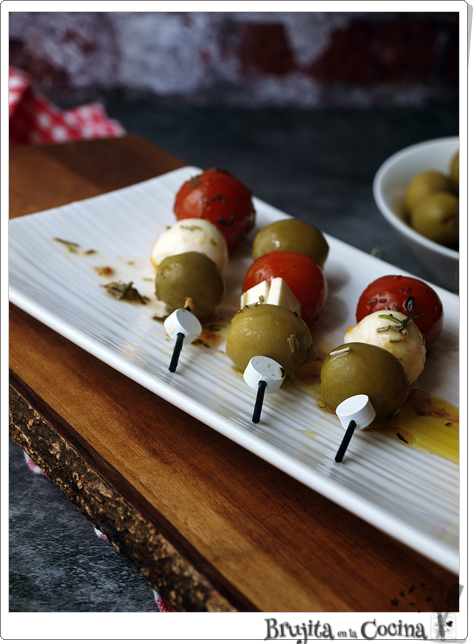 Para el montaje, es coger una o dos aceitunas grandes, rellenas de anchoa, después queso y tomate, vamos alternando, pero siempre tiene que haber al menos una aceituna, un queso y un tomate.