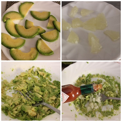 La otra mitad la trituramos con un tenedor , le añadimos la cebolla picadita, sal, unas gotas de tabaco y zumo de limón al gusto.