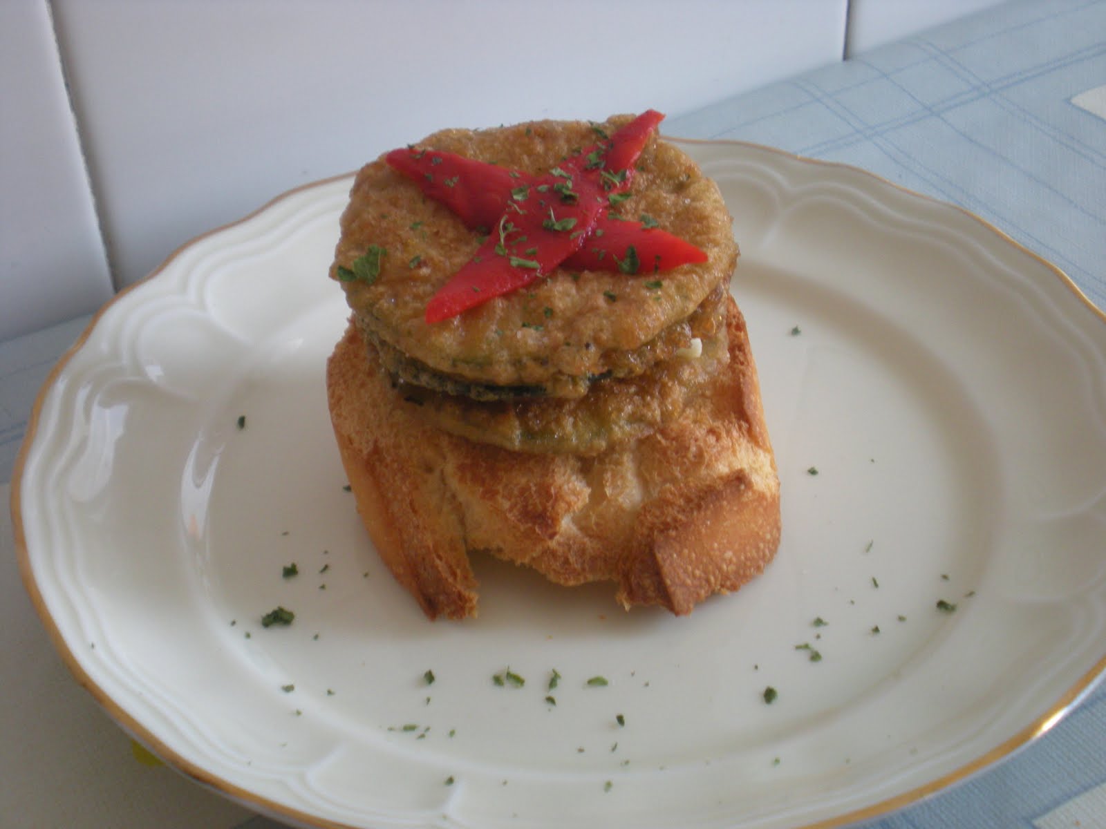 *Cortamos tres finas lonchas de calabacín y las rebozamos. Sobre una rebanada de pan previamente tostada, colocamos de forma alterna una lamina de queso y otra de calabacín.