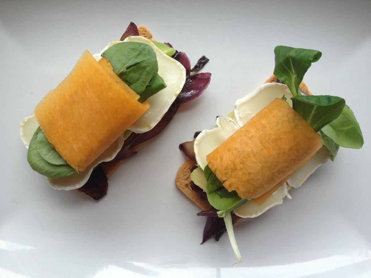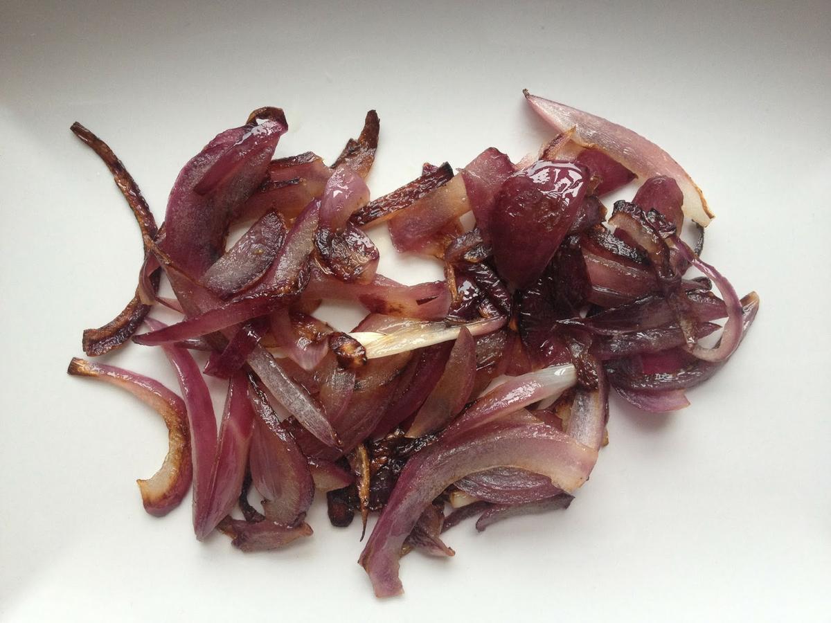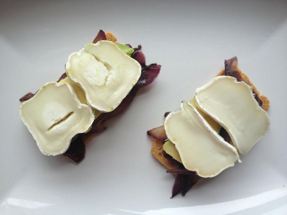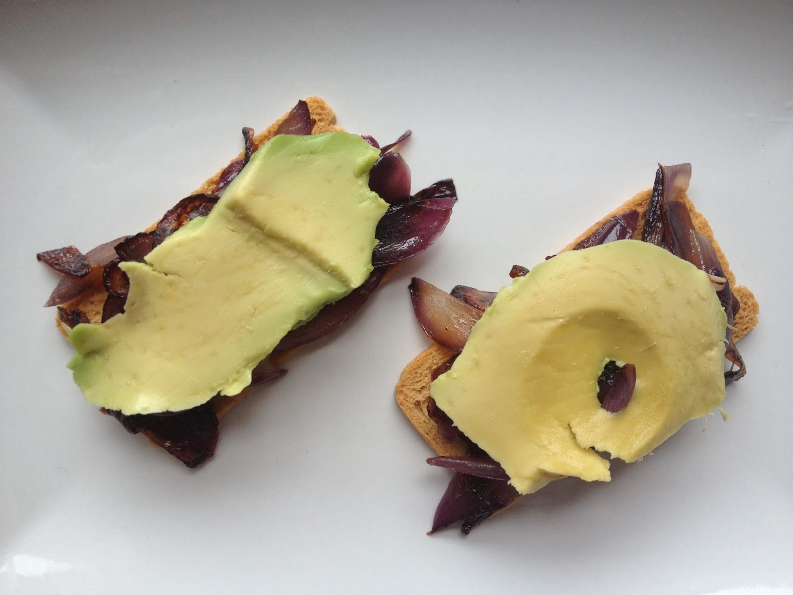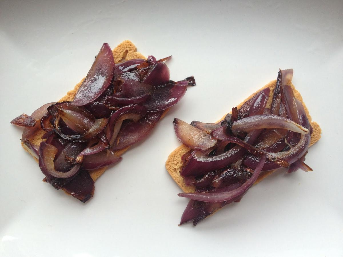 Colocamos primero la tostada y sobre la tostada ,la cebolla pochada ..