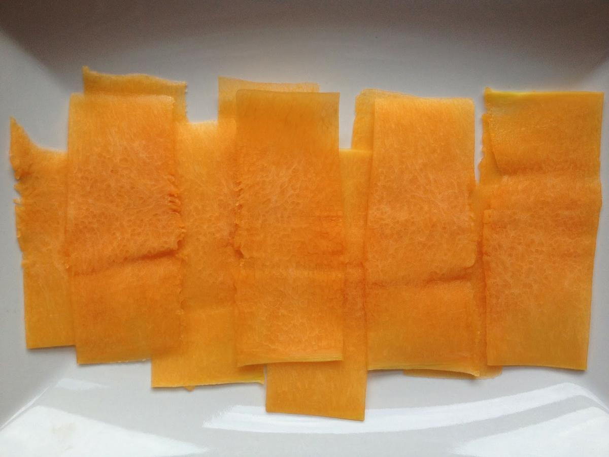 3 Aprovecharemos para hacer el carpaccio, animo que es muy fácil , usaremos un simple pelador de patatas ,pero primero limpiaremos la calabaza retirando su piel .