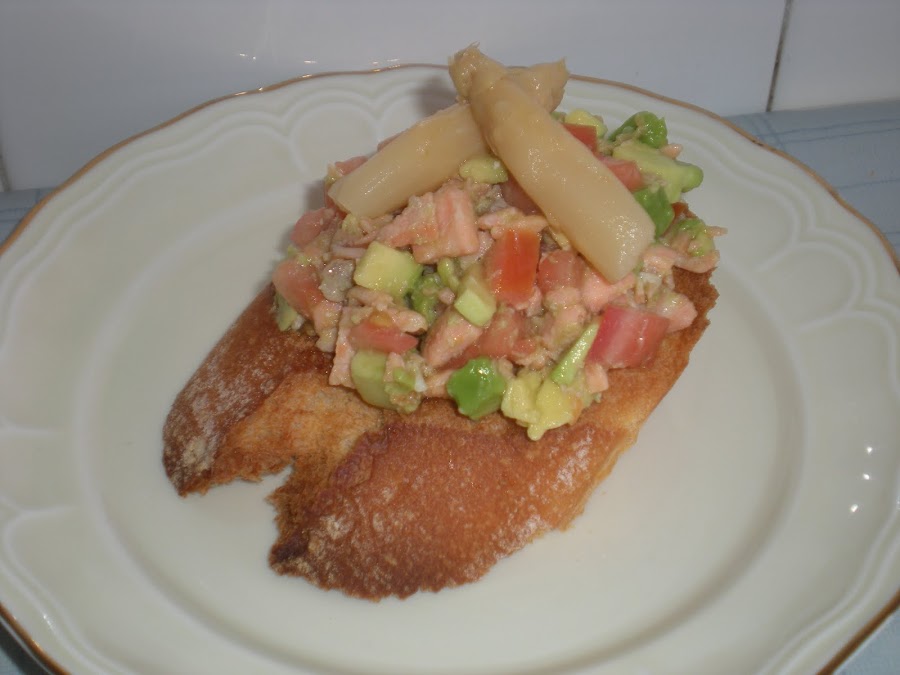 Preparamos un aliño con limón, aceite y sal, y lo echamos sobre los ingredientes de la ensalada. Montamos todo sobre una rebanada de pan previamente tostada, adornamos con unos espárragos y listo para comer !!!