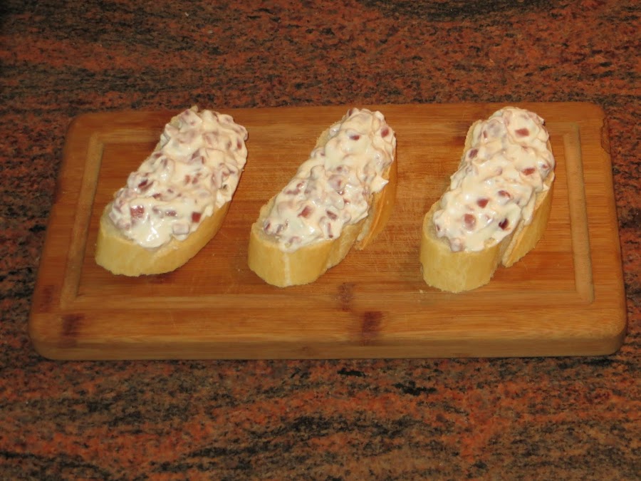 Cortáis el pan en rodajas y el jamón en trozos pequeños. El jamón se lo añadís a la mezcla y colocáis una montaña sobre las rebanadas de pan. Ya veréis que bocado más exquisito y si visitáis Zaragoza no dejéis de probar este pincho.