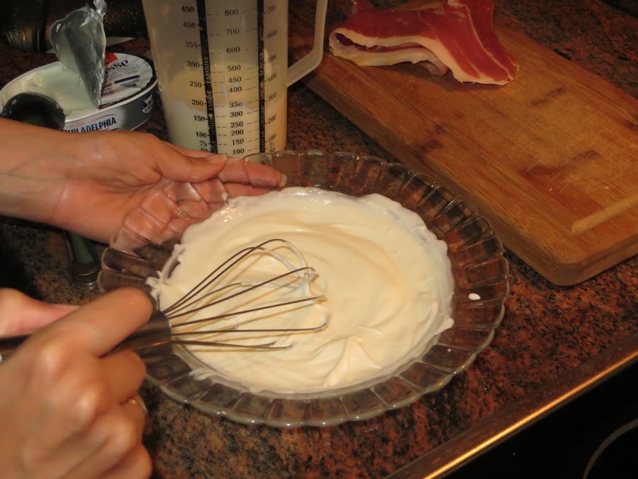 Si la mayonesa es casera mucho mejor, ya que le dará más gusto al plato, pero si no os vale una de bote. Si la hacéis casera, echarle muy poca sal porque el jamón ya es lo suficiente salado. Por cada dos cucharadas soperas de mayonesa, echáis una de queso crema, batís la mezcla.