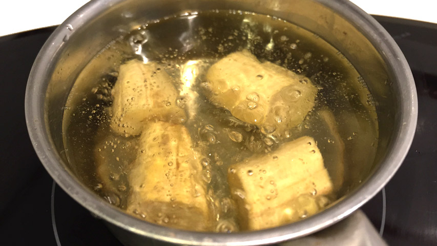 Cada plátano se corta en 4-5 trozos que en un primer momento se fríen durante 10 m con el aceite no muy caliente para que se ablanden.